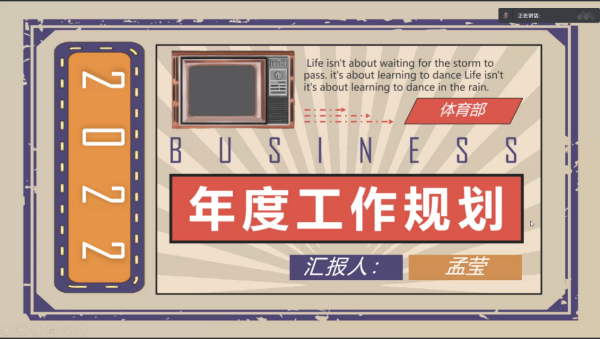 孟莹代表体育部进行部门工作规划汇报。孟莹介绍了体育部在新一学年的规划:包括运动打卡、线下电竞、趣味运动会、羽毛球比赛、全民运动会、中心杯系列球赛和荧光夜跑等活动。孟莹总结了体育部在上一学年取得的成就,并对新一年的学生会工作提出了新的期许,最后,孟莹鼓励同学们积极参加体育锻炼,全方面提升自身素质。