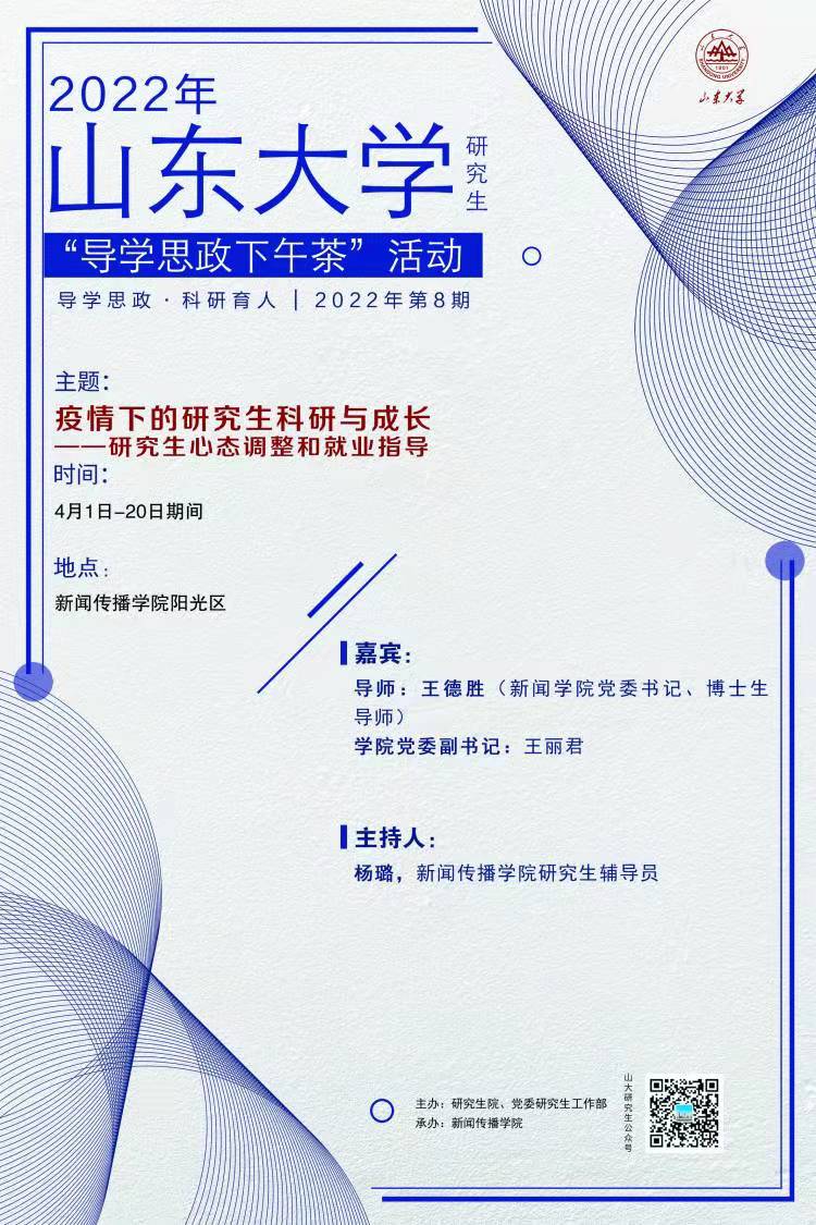 4月11日下午,det365登录网站主页举办了以“疫情下的研究生科研与成长”为主题的“导学思政下午茶”活动,本次活动专题聚焦“疫情防控期间研究生心态调整和就业指导”。学院党委书记、博士生导师王德胜,学院党委副书记王丽君和硕士毕业生进行了交流,活动由研究生辅导员杨璐主持。