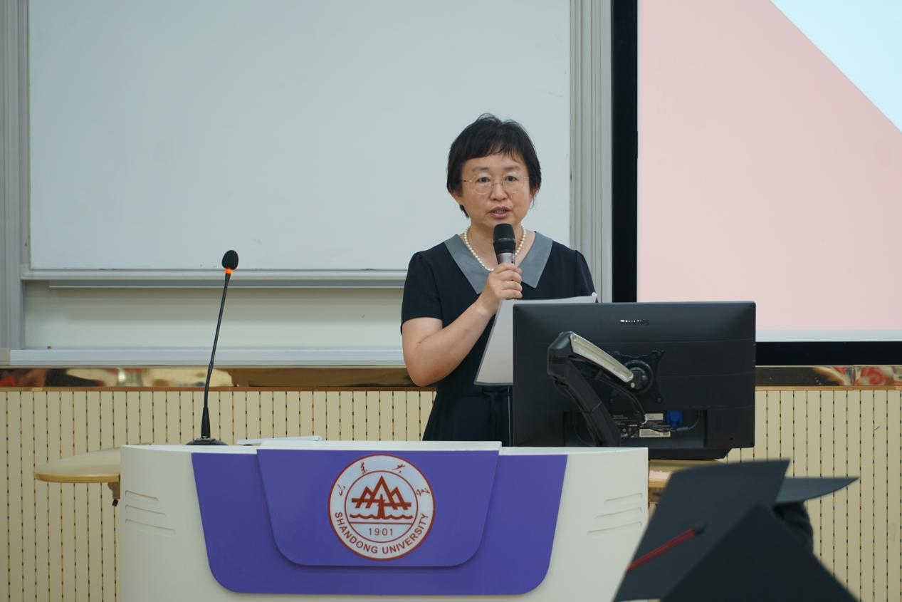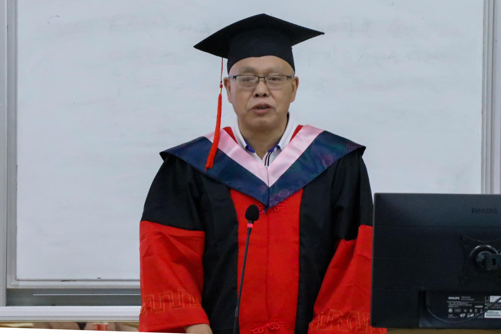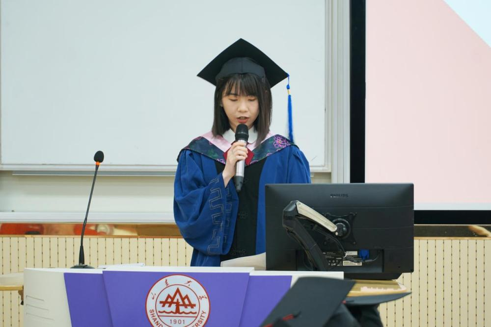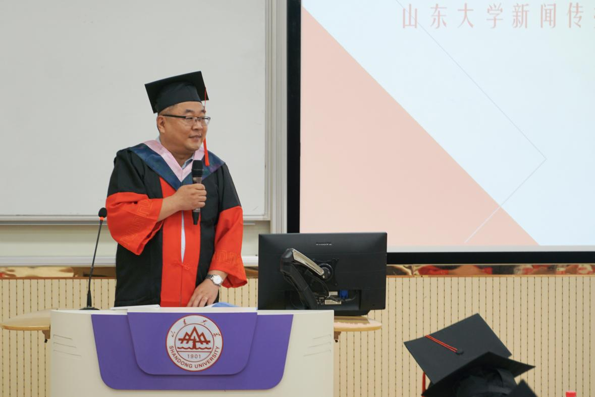 随后,于智源和戴元初分别作为教师代表向同学们寄语。教师代表于智源首先祝贺同学们顺利完成学业,回顾了同学们四年来的求学经历,并向同学们寄语:希望同学们精益求精地做好每一件小事,充实自己的人生经历,在不同的岗位继续书写“山大故事”、“新传故事”。教师代表戴元初教授带领大家回忆了三年来疫情之下特殊的研究生生涯,祝愿大家无论面对何种不确定性,内心都能够始终保有一份真诚、热爱和勇敢,真诚面对自己的内心,热爱独特的自己,勇敢地在真实世界里闯荡,去做这个时代不一样的自己。