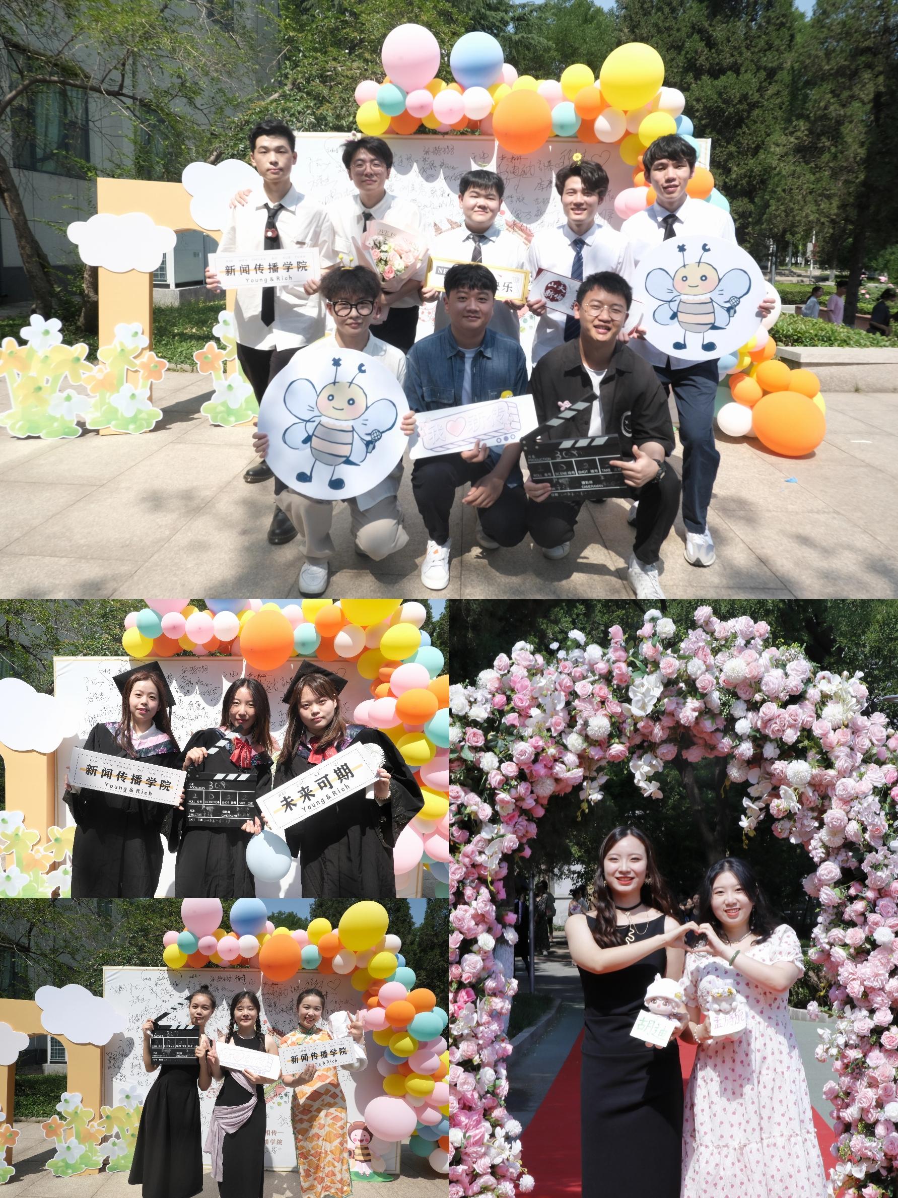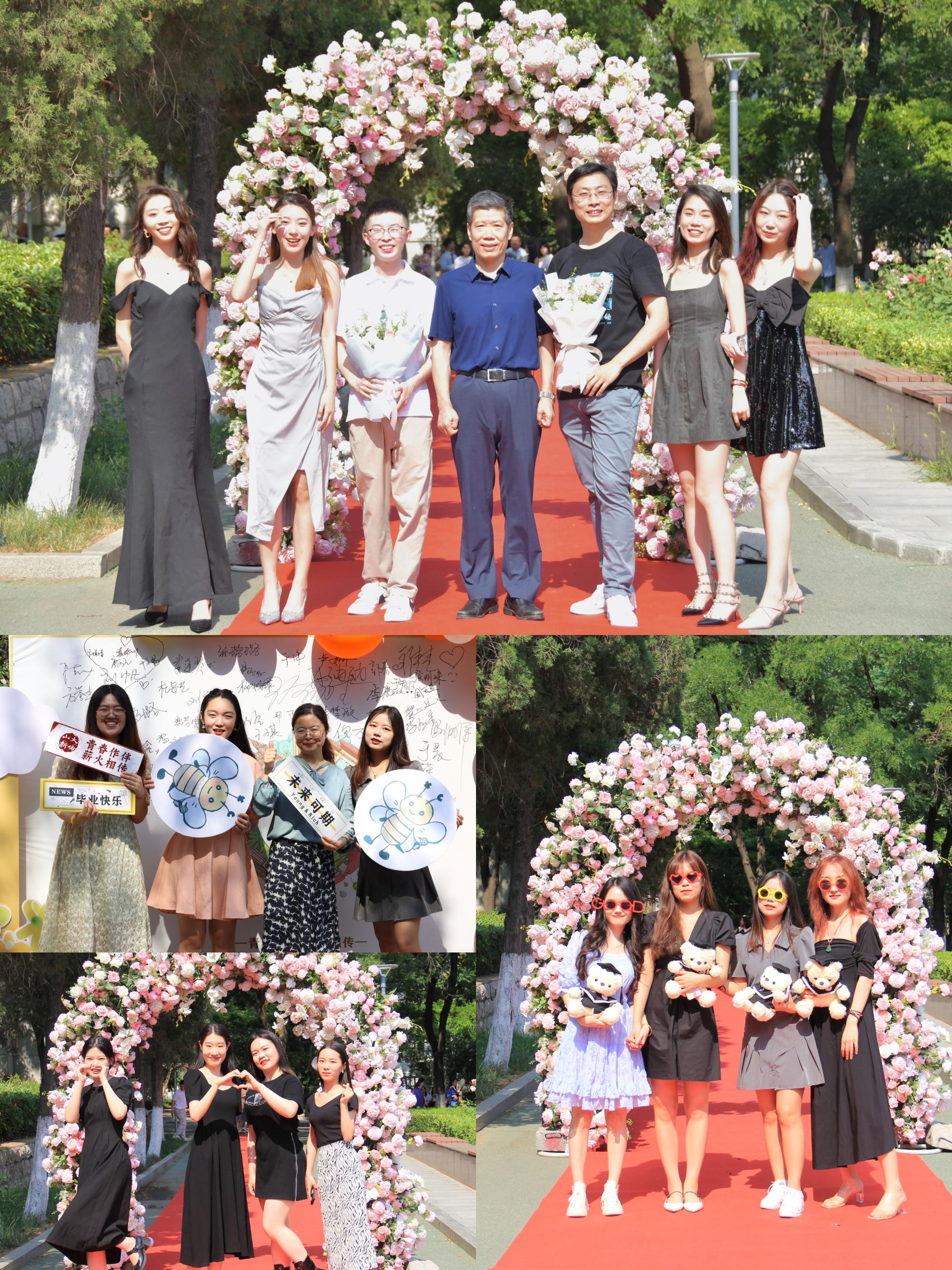 不仅如此,在毕业典礼开始前,学院为毕业生们举办了红毯仪式,2022届本硕毕业生们在老师与同学们的陪伴与祝福中走过红毯,穿过繁花拱门,在签名墙上写下名字并合影留念,开启人生新篇章。学院的师弟师妹为毕业的师哥师姐精心设计了毕业礼物,带有姓名的毕业熊,山大新传图案的文化衫和帆布包,寄托对毕业生们最真挚地祝愿。