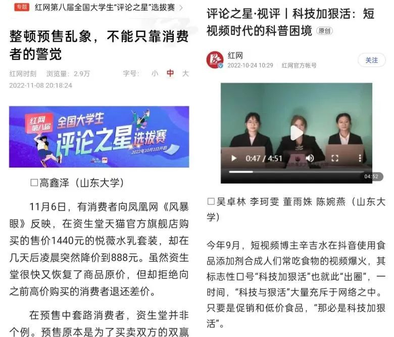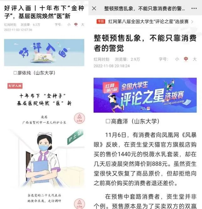 红网第八届全国大学生“评论之星”选拔赛已于2022年10月1日正式启动,面向全国所有高校大学生征集参赛作品。截至目前,det365官网2020级本科生已在红辣椒平台发表评论作品136篇,其中文字评论87篇、漫画评论17篇、视频评论31篇,作品被光明网、环球网、新浪新闻、搜狐网、网易新闻、腾讯网、中国青年报、中国经济网等媒体转发推广。