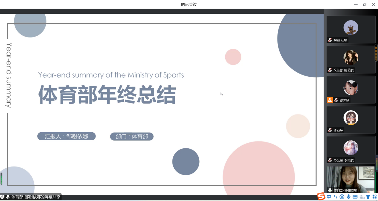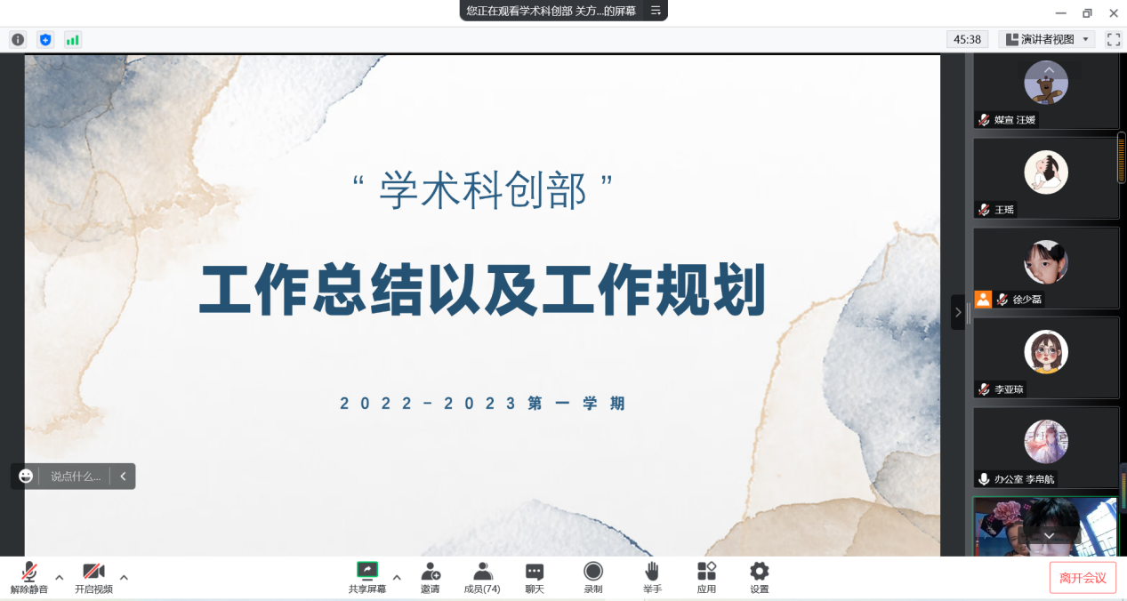 学生会各部门围绕工作总结和工作规划,结合部门特色,依次发言。办公室代表王华桥梳理了部门存在的问题及解决方案,并介绍了部门对下学期日常工作及大型活动的规划。媒体宣传中心代表李亚琼展示了部门设计物料、运营栏目等主要工作的成果。学术科创部代表关方云重点介绍了部门负责的保研考研分享会等三项已完成活动和青年评热点等两项进行中活动。文艺部代表唐艺航呈现了新生征集、迎新晚会等活动的时间线,总结了成功经验,反思了不足之处。体育部代表邹谢依娜特别指出可以向其它学院借鉴活动方案,并从时间、对象、内容、预期效果等角度分享了部门对下学期体育活动的规划。志愿工作与生活部代表许伊萌则对部门负责的宿舍检查、社团事务、志愿活动工作进行了全面的介绍。