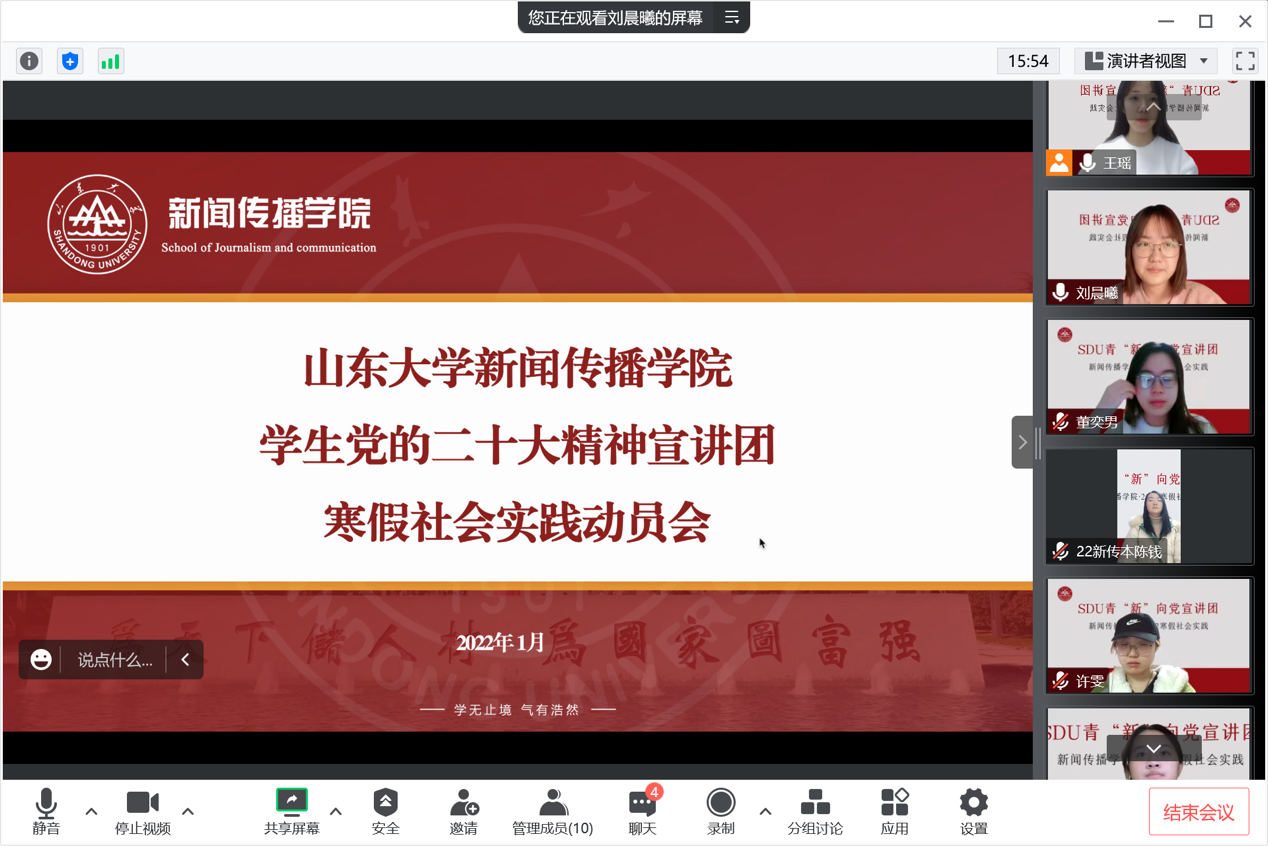 为深入学习宣传贯彻习近平新时代中国特色社会主义思想和党的二十大精神,更好展开寒假社会实践,1月6日晚,det365登录网站主页学生宣讲团召开寒假社会实践动员会,会议通过腾讯会议举行,宣讲团全体成员参会,队长刘晨曦主持会议。