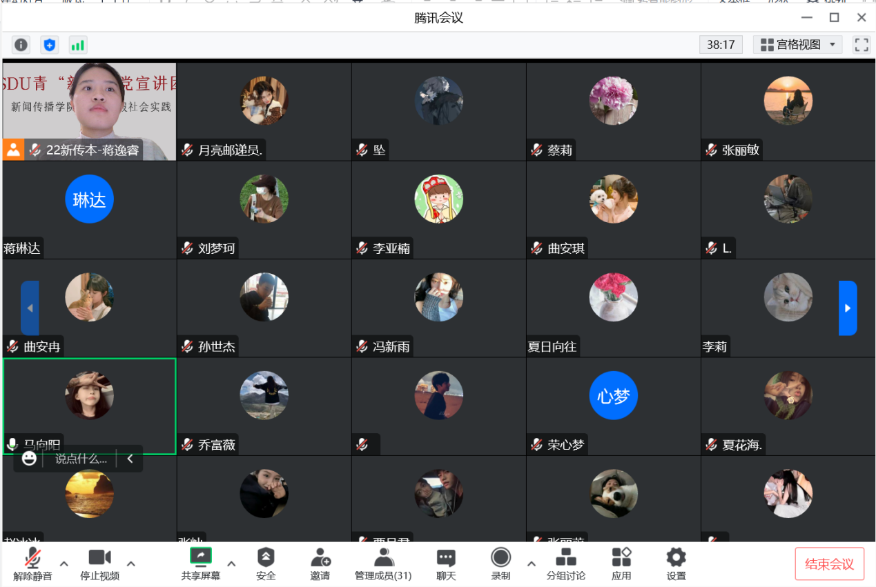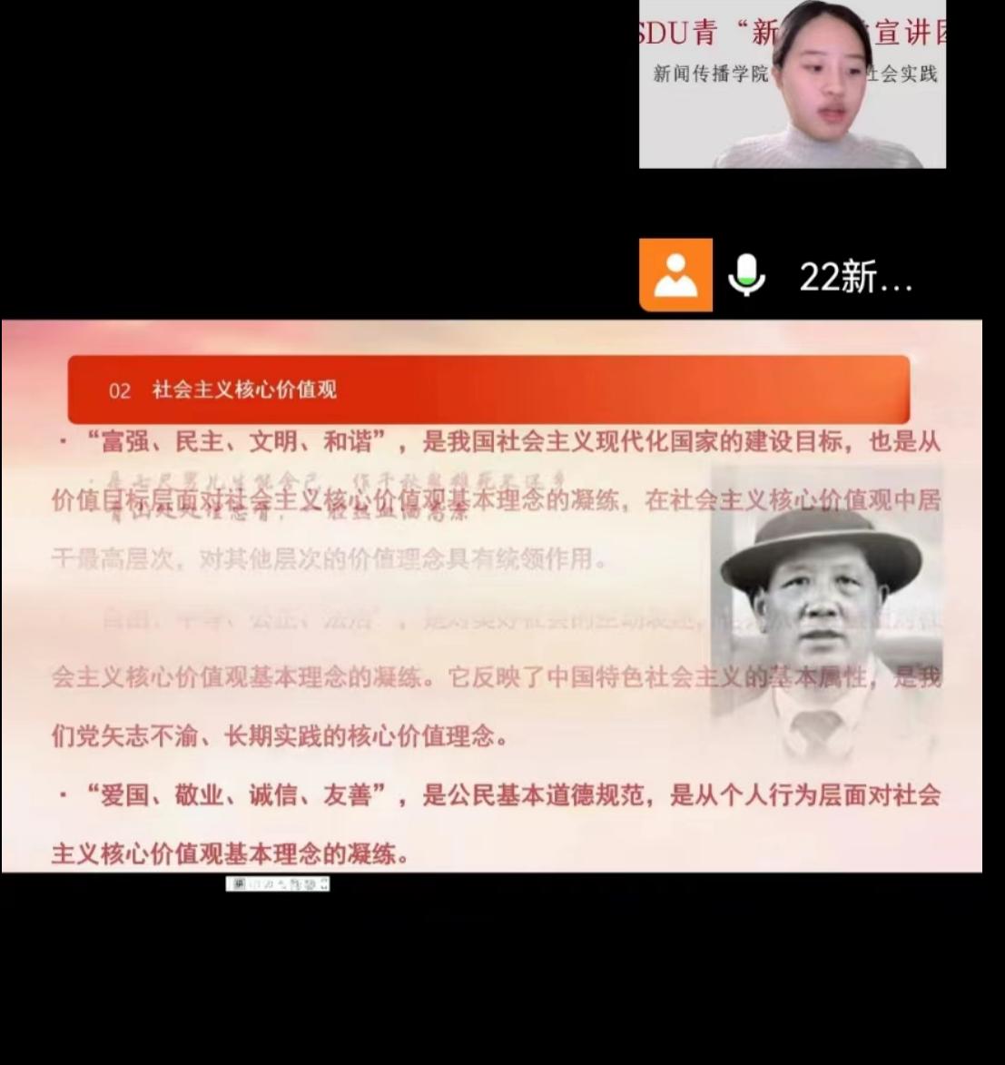 为深入学习宣传贯彻党的二十大精神,做好寒假社会实践,1月11日晚,det365登录网站主页“青新向党”学生宣讲团成员蒋逸睿,通过腾讯会议线上方式,面向山东省聊城市技师学院22级会计专业的学生进行党的二十大精神宣讲。