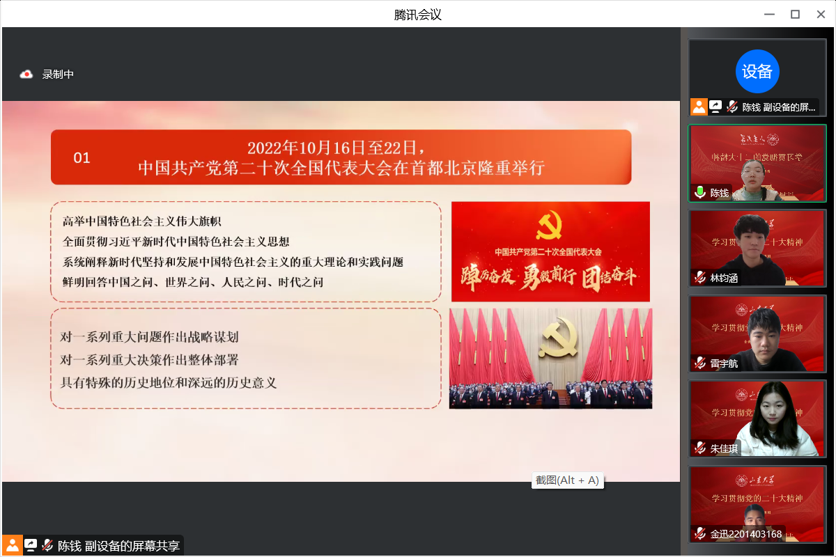 陈钱首先向大家介绍了党的二十大召开的背景和重要意义。党的二十大是在全党全国各族人民迈上全面建设社会主义现代化国家新征程、向第二个百年奋斗目标进军的关键时刻召开的一次十分重要的大会,是一次高举旗帜、凝聚力量、团结奋进的大会,在党的发展历史上具有特殊的地位和深远的意义。