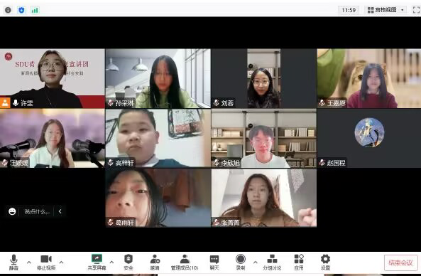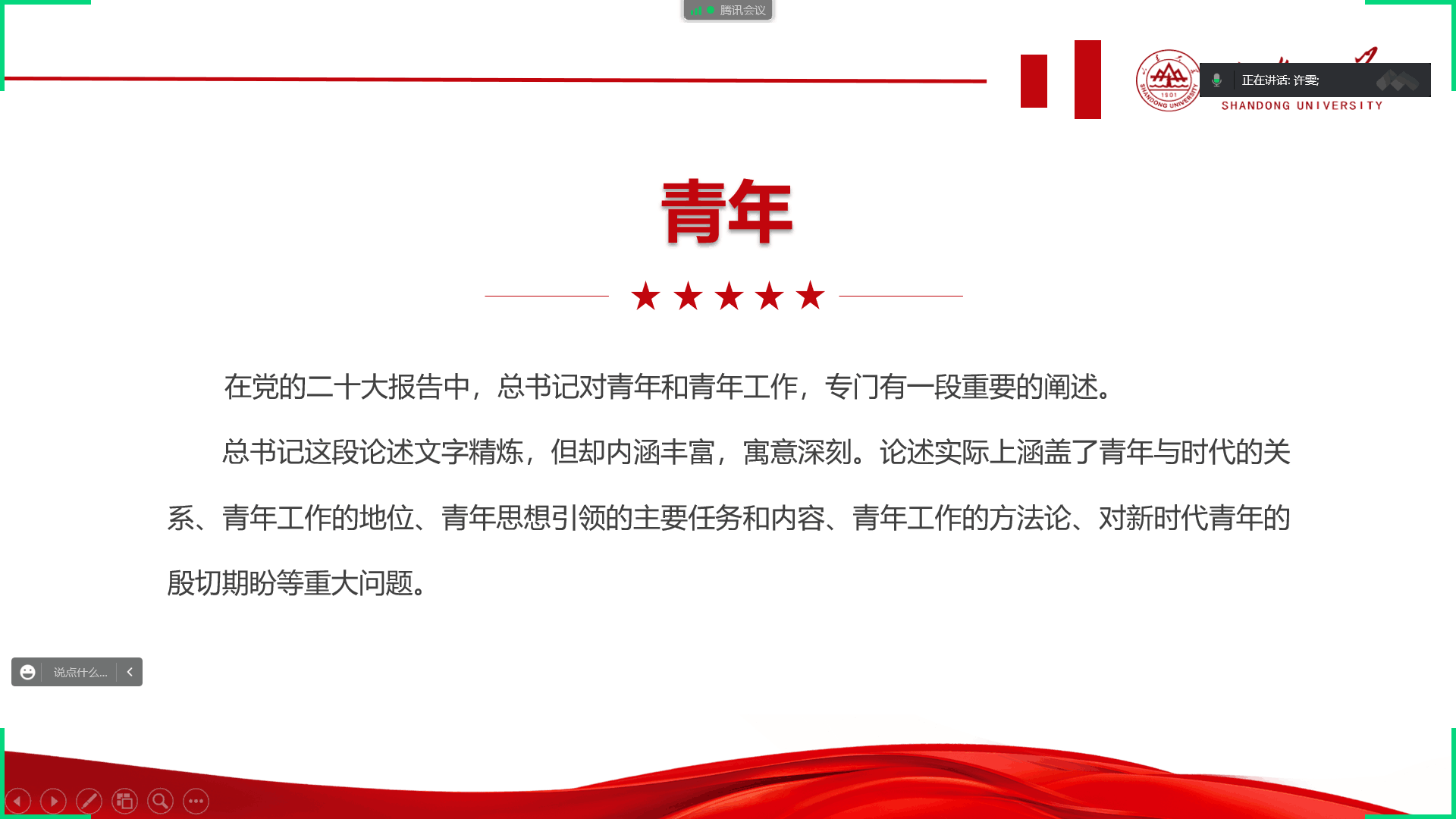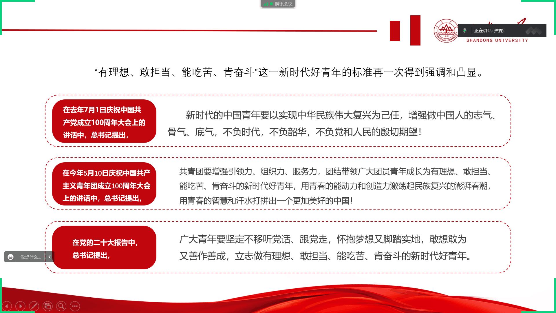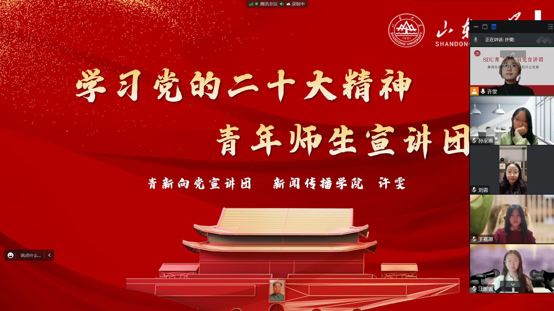 为进一步深入学习宣传贯彻党的二十大精神,让青年们在学习中砥砺初心使命,汲取奋进力量,1月16日晚上,det365登录网站主页“青新向党”学生宣讲团成员许雯,通过腾讯会议的方式,在山东威海向山东临沂支教团队进行宣讲。此次宣讲以“奋斗新时代,青春正当时”为主题,许雯结合党的二十大报告中有关青年的内容,围绕新时代新思想、新成都新实践,讲述新青年新奋斗的生动故事。