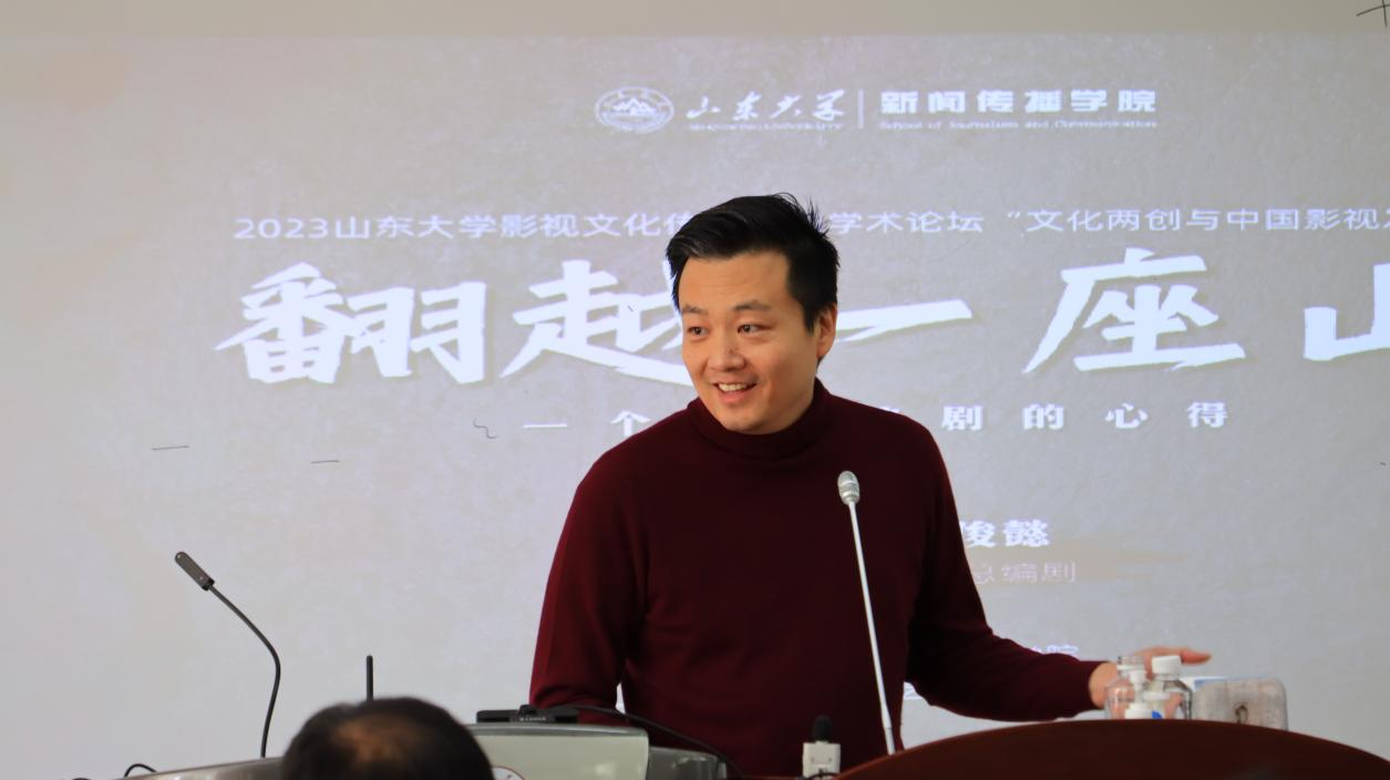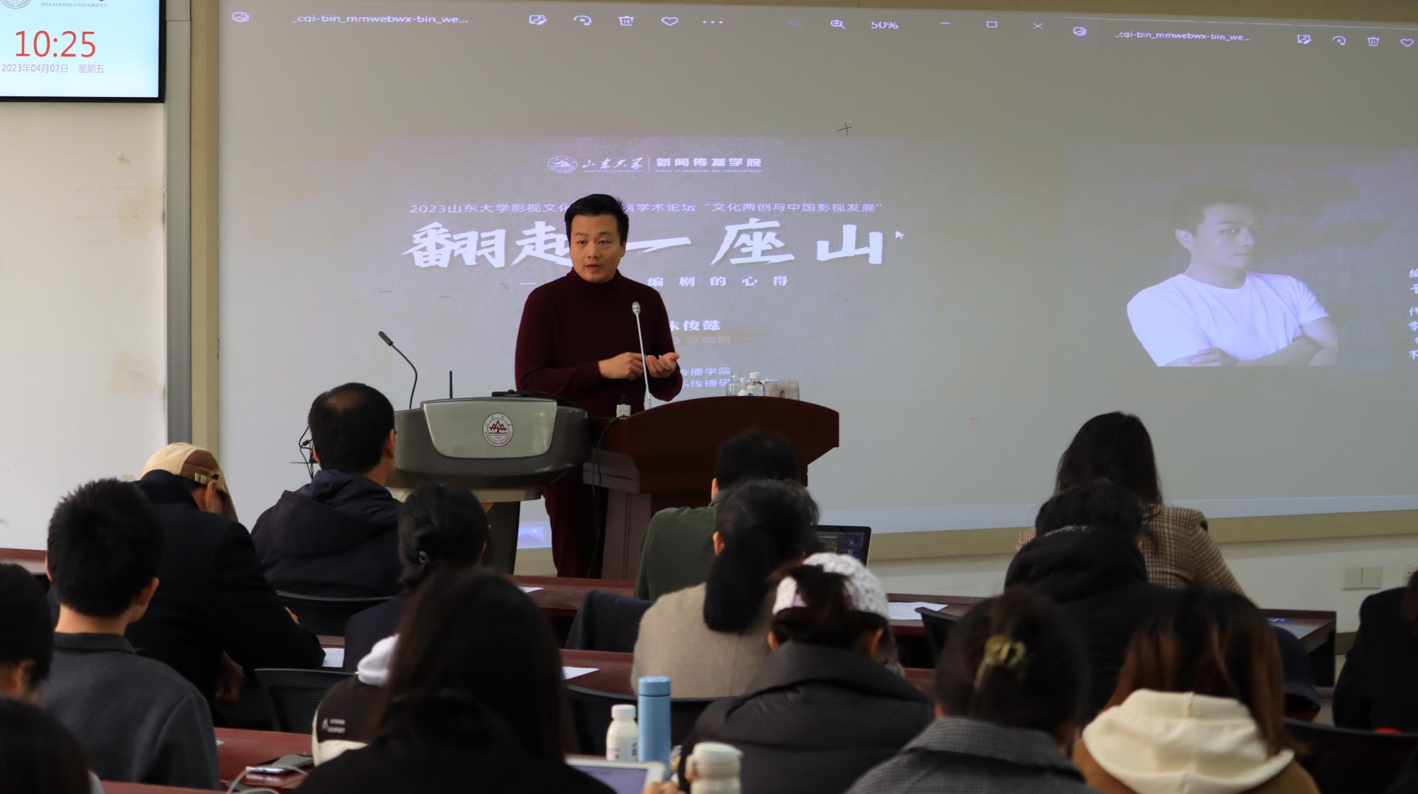 4月7日,由det365登录网站主页主办的det365登录网站主页影视文化传播高端学术论坛“文化两创与中国影视发展”在中心校区拉开帷幕。首期活动特邀本年度同步席卷荧屏和互联网的顶流热播电视剧——《狂飙》的总编剧朱俊懿作为主讲人,讲座主题是“翻越一座山——一个外行编剧的心得”。det365登录网站主页副教授、det365登录网站主页影视文化艺术传播研究中心执行主任于晓风担任本场主持。来自山东省广播电视协会、济南大学、山东传媒职业学院、山东影视传媒集团、山东齐鲁壹点传媒有限公司、日照电影家协会等单位的专家学者齐聚一堂,共同围绕电视剧《狂飙》的创作、阐释、解读和传播进行深度探讨。