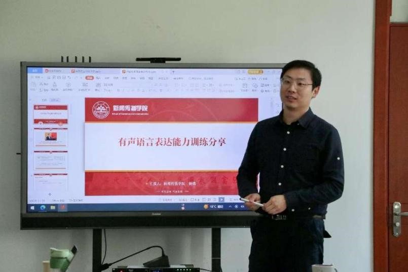杨璐就“师生有声语言表达能力提升”这一主题进行分享,通过对于语言表达的呼吸控制、共鸣运用、基础语音、声音弹性等内容的讲解,对师生有声语言表达的发音技巧和训练方法进行详细阐述。他向老师们阐述了高校师生训练有声语言表达的重要性,指出师生沟通中的语音语调、情感状态会对师生交流效果产生影响,“声音舒服、内容清晰、情感到位、状态自然”的有声语言表达能够更好地展现个人魅力、促进听众理解、增进传播效果。在讲解发声位置时,他结合案例现场教学展示胸腹联合式呼吸法,并从人体口腔生理结构的角度讲解了不同发音的具体发声位置以及鼻腔头腔共鸣、口腔共鸣、胸腔共鸣三种共鸣方式。在讲解发音吐字方面,他从“阴阳上去”的音调类型、声音弹性、连读变调等方面对发音吐字的标准和规范进行和阐释,并对声母韵母发声训练技巧进行分享。