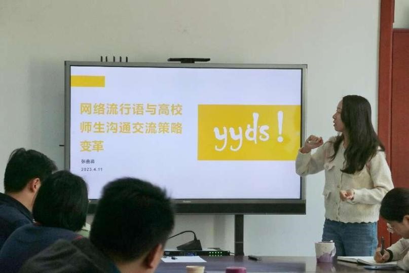 张鑫淼就“网络流行语与高校师生沟通交流策略变革”这一主题进行分享,指出网络流行语已经成为主流话语外的新型话语体系,随后从网络流行语编年史、近期网络流行语一览、网络流行语视域下青年群体特点和高校师生沟通交流策略变革等四个方面进行阐述。她首先介绍了网络流行语近十年的发展历程,就每一年中具有代表性的网络流行语进行了来源和用途解释,并据此对青年群体的特点进行分析。她指出,一方面当代青年在思想上多元开放,积极学习新兴网络流行语并通过二次创作迭代形成流行语“集团”,另一方面注重向世界解释“我是谁”,在张扬个性的过程中进行身份建构并寻求群体认同。除此之外,青年群体具有鲜明的反叛精神,更重视对公正、平等的价值观的追求而不单纯畏惧权威,同时会通过自嘲和反讽来释放生活中的压力。