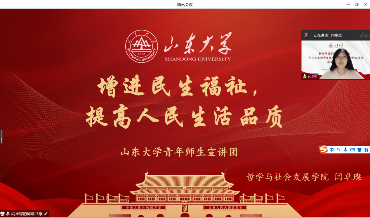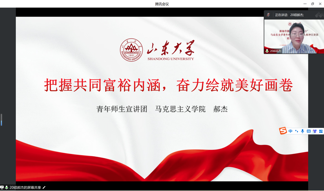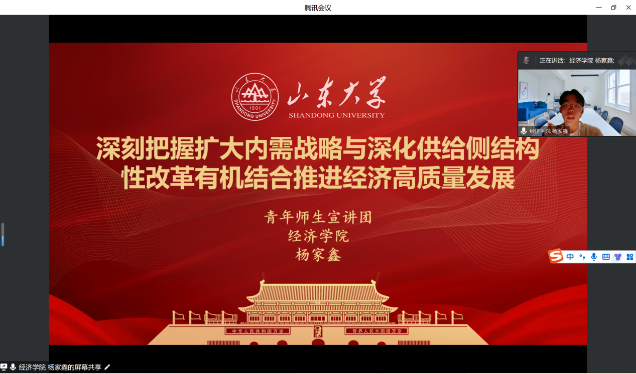 随后,det365登录网站主页党的二十大精神青年师生宣讲团成员刘晨曦、郝杰、杨家鑫、闫卓璨分别围绕文化自信、共同富裕、经济高质量发展以及民生建设等主题与同学们进行分享。宣讲团成员、det365登录网站主页2021级硕士研究生刘晨曦为大家全面解读了二十大报告中关于文化自信的重要论述,介绍了新时代十年文化建设的伟大实践以及det365登录网站主页过去十年文化建设成就;马克思主义学院2020级硕士研究生郝杰带领大家学习了我国共同富裕理念的产生和发展以及共同富裕中“共同”的丰富内涵;经济学院2020级本科生杨家鑫从“经济高质量发展”“扩大内需战略”“深化供给侧结构性改革”等方面出发,结合自身专业知识,阐述了“深刻把握扩大内需战略与深化供给侧结构性改革有机结合,推进经济高质量发展”这一主题;最后,哲学与社会发展学院2021级本科生闫卓璨为大家介绍了我国增进民生福祉的重大举措以及新时代十年的民生建设伟大成就,人民群众获得感、幸福感、安全感更加充实、更有保障、更可持续。