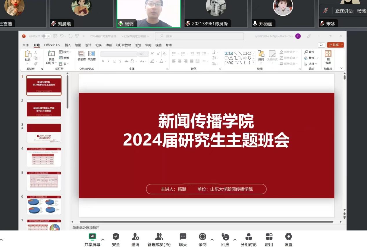 会议开始,杨璐为大家介绍学院历年的就业情况,并就今年的就业形势给大家提供指导和帮助。首先,他对本学院的就业概况、就业去向、签约单位等方面进行了简要梳理与分析。他表示,新闻传播专业就业面广,同学们的选择多样化,就业率保持在相对良好的状态。其次,杨璐介绍了就业签约的基本程序,根据不同毕业生的不同就业选择,对材料准备、应聘、签约等环节进行了说明。其中,对于应届毕业生的理解、三方协议签署等同学们关心的问题进行了重点讲述。他提醒大家要正确看待应届生身份,积极就业,在签署三方协议时要维护好自身的权益。会议中,杨璐向大家演示了学校就业管理服务系统的操作流程,提醒同学们要及时查看就业信息,珍惜秋招机会,多与导师和辅导员沟通。最后,他结合自身经历,向大家分享了简历制作技巧和注意事项,鼓励大家结合自身条件,丰富简历内容,增强简历与岗位之间的匹配度。