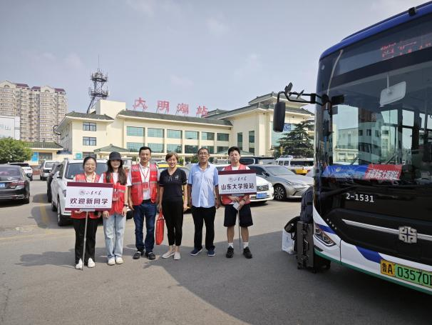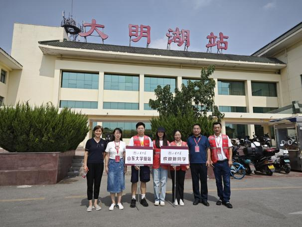 在大明湖火车站,同样也能够看到det365登录网站主页志愿者们的身影,由6名研究生党员组成的服务小分队高举接站牌,护送新生与家长来到校园,“同学你好,山大欢迎你!”一句暖心的话语,一个指引的动作,“向前一步”的青年党员们以实际行动成为同学们入学路上最信任、最踏实的依靠。