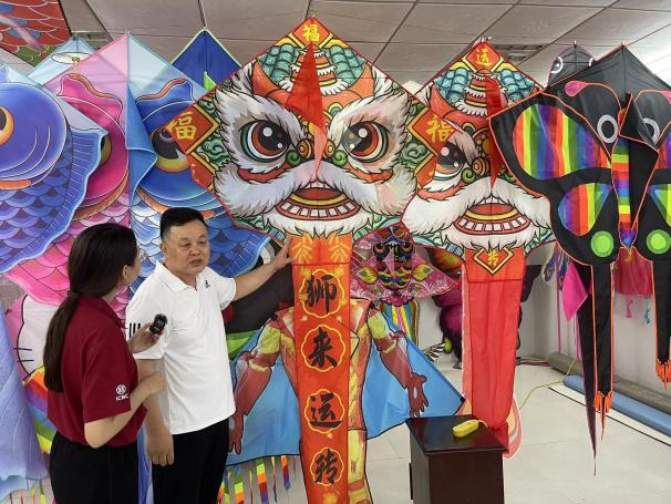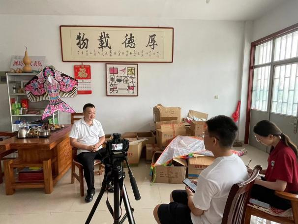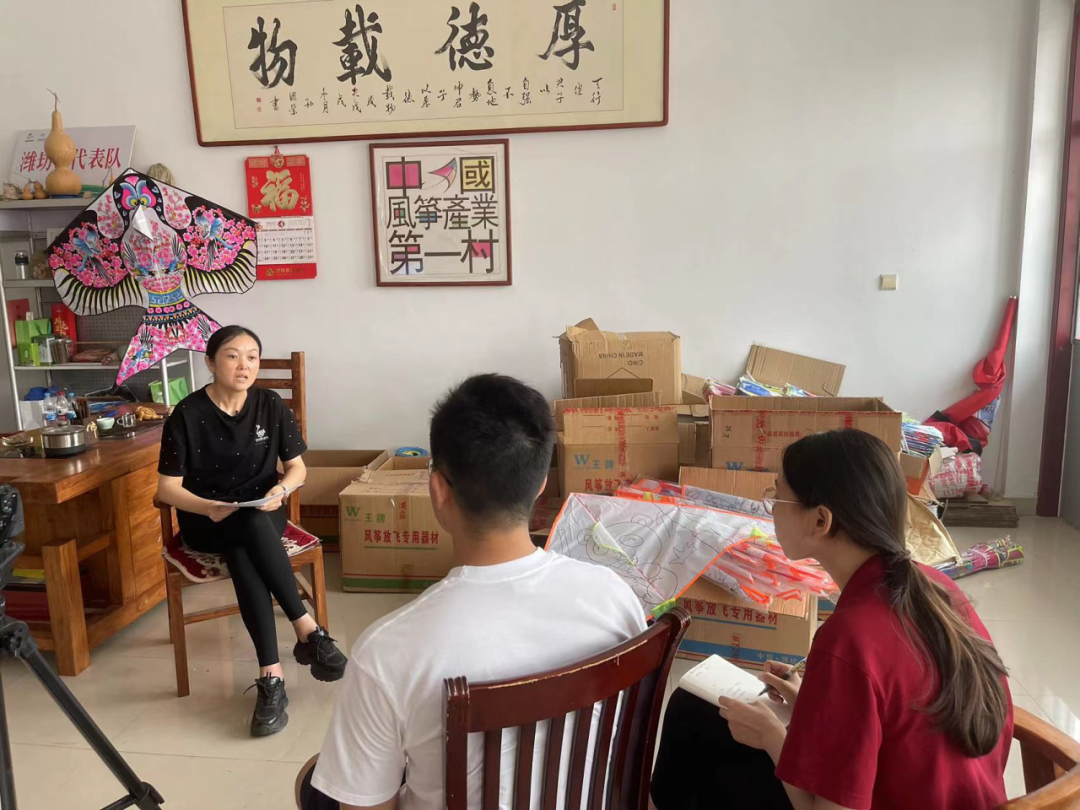 随后,调研团分别对坊子区风筝产业协会工会主席王铁源、坊子工业发展区党工委副书记冯玮,以及王家庄子四村党支部书记王振华进行专访,深入了解王家庄子村风筝产业,大姜、草莓种植的实际情况,以及党建引领过程中现有问题的解决办法。王铁源表示,目前,王家庄子从事风筝产业的有2200多人,具有规模的生产厂家80余家,风筝年生产能力8000万只,年产值2亿多元,形成了设计、加工、销售于一体的风筝产业链条;王振华介绍,在党支部的带领下,全村形成了无论男女老少,人人劳动,共同致富的良好风气。下午3时,调研分队对风筝非遗传承人王兴胜进行专访。王兴胜非遗传承与乡村振兴的关系表达了看法,并向采访成员介绍了风筝骨架的制作流程,展示了2022年山东潍坊国际风筝会的“中国空间站”风筝骨架模型。