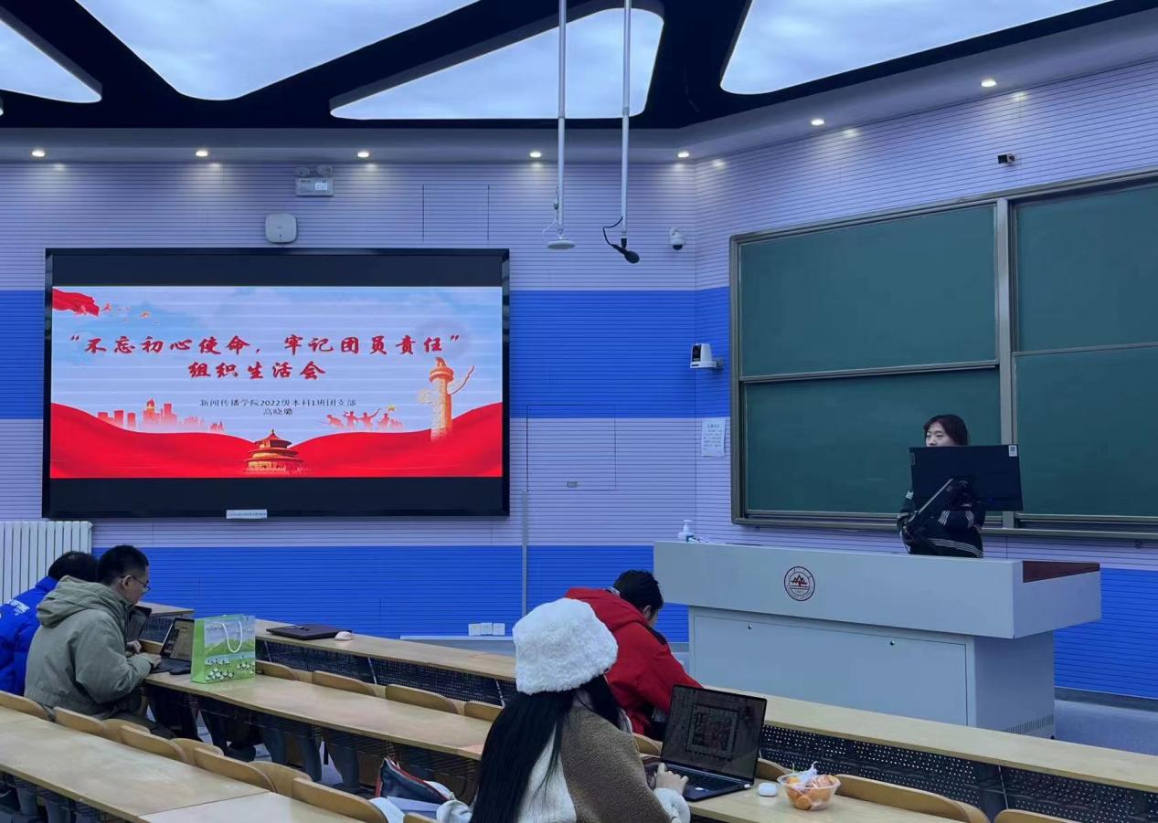 2022级本科生2班团支部团支书陈钱介绍团支部过去一年的基本情况,从班子建设、团员管理、组织生活、作用发挥方面报告团员和青年主题教育开展情况。同时,她也指出团支部存在青年大学习完成率仍有待提高的不足等情况,最后对团支部所有团员对支部所作贡献表示感谢,也表达了共同打造更优秀团支部的信心。团支部副书记、支部委员总结了团支部过去一年所取得的成绩,对支部同学积极参与各项活动、拼搏奋进的精神表示赞扬,并介绍了团员评议的民主评议流程。班主任李颖异发言表示希望通过此次组织生活会,各位团员能够端正态度,积极迎接新的一年,用自己的努力与奋斗在大时代立功立言。最后,陈钱带领全体团员重温入团誓词,深化了全体团员对团员初心使命的理解。