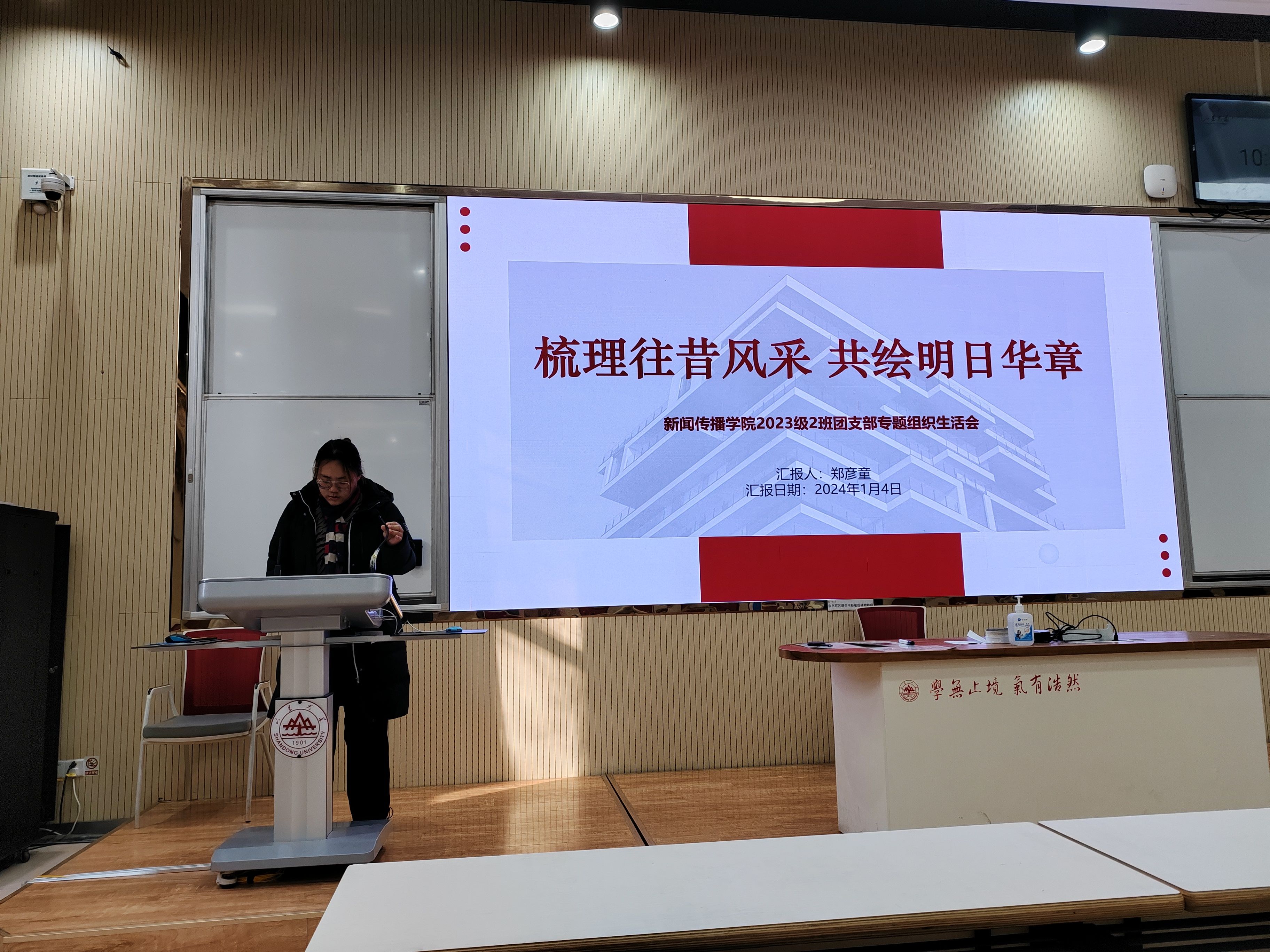 2023级硕士生团支部团支书胡筱对本学期开展的团支部活动和主题团课情况进行了总结,反思了团支部目前在工作思路和活动开展上存在的不足,并提出了今后的改进方向。团委副书记张鑫淼向大家介绍了团员先进性评价的相关信息,围绕参评范围和基本流程为大家进行了讲解。辅导员祝晓彤发言,表达了对同学们学习生活的关心,并对同学们进行了期末的诚信教育。最后,胡筱带领团员们重温入团誓词,回顾入团初心。