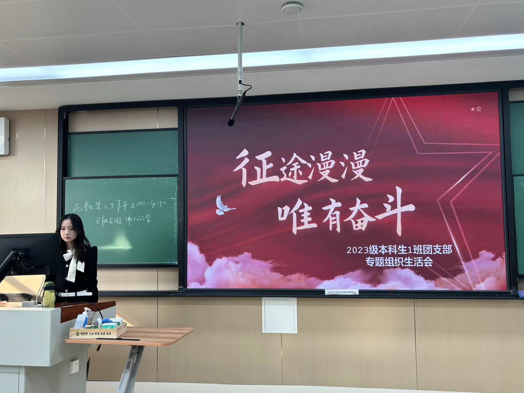 2023级本科生1班团支部团支书张慧依介绍了本学期开展的主题教育相关活动,重点介绍了“风华正茂,青春颂党”为主题,团支部立项工程相关工作进展成果。而后团支部副书记孙梦琛回顾了本学期工作开展情况,分别从理论和实践,统筹和落实四个层面反思不足,提出展望。团员们分享感悟心得体会,交流经验收获。辅导员竹雅点评此次会议的开展及本学期支部工作情况。并对未来支部工作发展规划提出建议。最后,张慧依带领大家重温入团誓词并为大家介绍团员先进性评价的相关流程及标准。