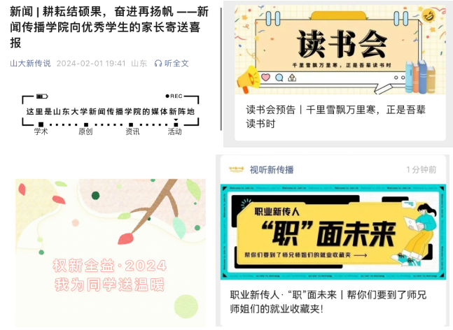 det365登录网站主页高度重视学生假期管理和服务工作,在假期前详细制定了寒假工作方案和学生关爱计划。为优秀学子家中寄送喜报,组织团队参与文化实践调研,开展“云阅读”读书会,发布“权新全益:假期生活安全提醒”推文,组织“青年品牌官”乡村振兴创意活动比赛,进行“职业新传人:‘职’面未来”学生假期就业指导活动。通过多种形式、多种平台,从生活帮助、学业帮扶、职业规划、文化实践等方面为学生的假期生活提供支持,确保新传学子度过一个安全、快乐又充实的假期,以更加饱满的情绪和更加积极的状态步入全新一年。