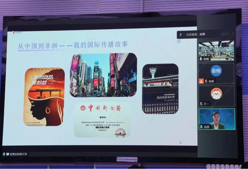之后,高熹老师就“用视听语言讲述中国故事”的主题展开详细介绍。分享自己从中国到非洲到世界的国际传播故事,提出“国际传播谁来讲故事?中国还是外国?”“为什么我们要讲好中国故事”“世界了解的中国是什么样的”的问题并进行见解分享,得到“中国人和外国人都要讲,且要客观公正地讲”的答案。接下来围绕“怎么来讲中国故事” 这一重点,分享了“故事里的价值观念”“故事里的思维方式”“故事里的语言转换” 这三条在国际传播工作中得出的经验。最后围绕”怎么开启你的国际传播故事“提醒同学们认真学习专业知识,提高外语水平,多关注国际历史与新闻的同时积极实习,为自己在新闻传播领域的未来工作打下坚实基础。