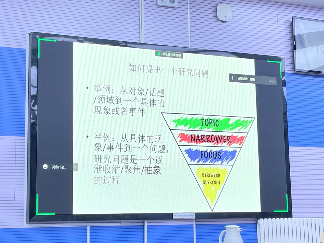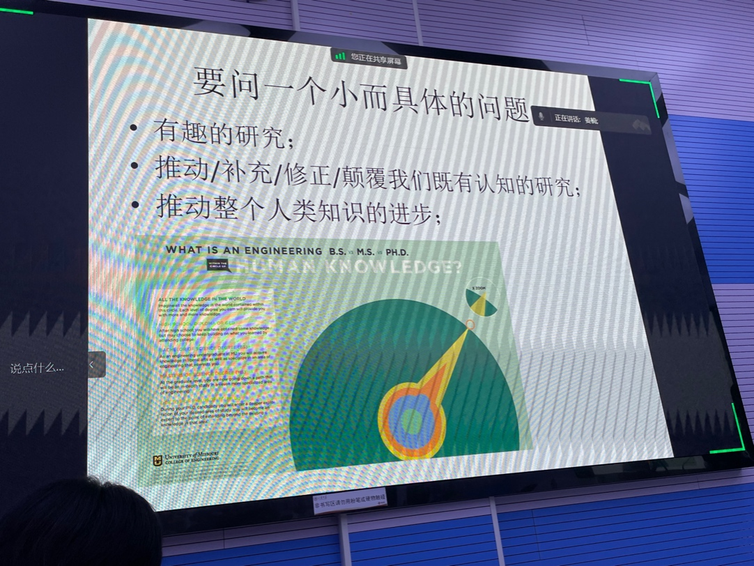 那么一个好的研究问题是什么样的?苗老师概括了如下几点:首先,研究问题要是一个带问号的问句。其次,研究问题不要大而空泛。再次,问题要有“问题感”,不要问大家脑海中已有既定答案的,要有矛盾、有张力、有困惑性,甚至是反常识的问题。最后,要有读者意识。具体来说,所谓研究问题不要大而空泛,是指问题需要具体而细微。苗老师用一张图生动地进行了描绘。“我们现在处于这个黄的尖尖上,我们的任务就是把这个尖尖往前推。