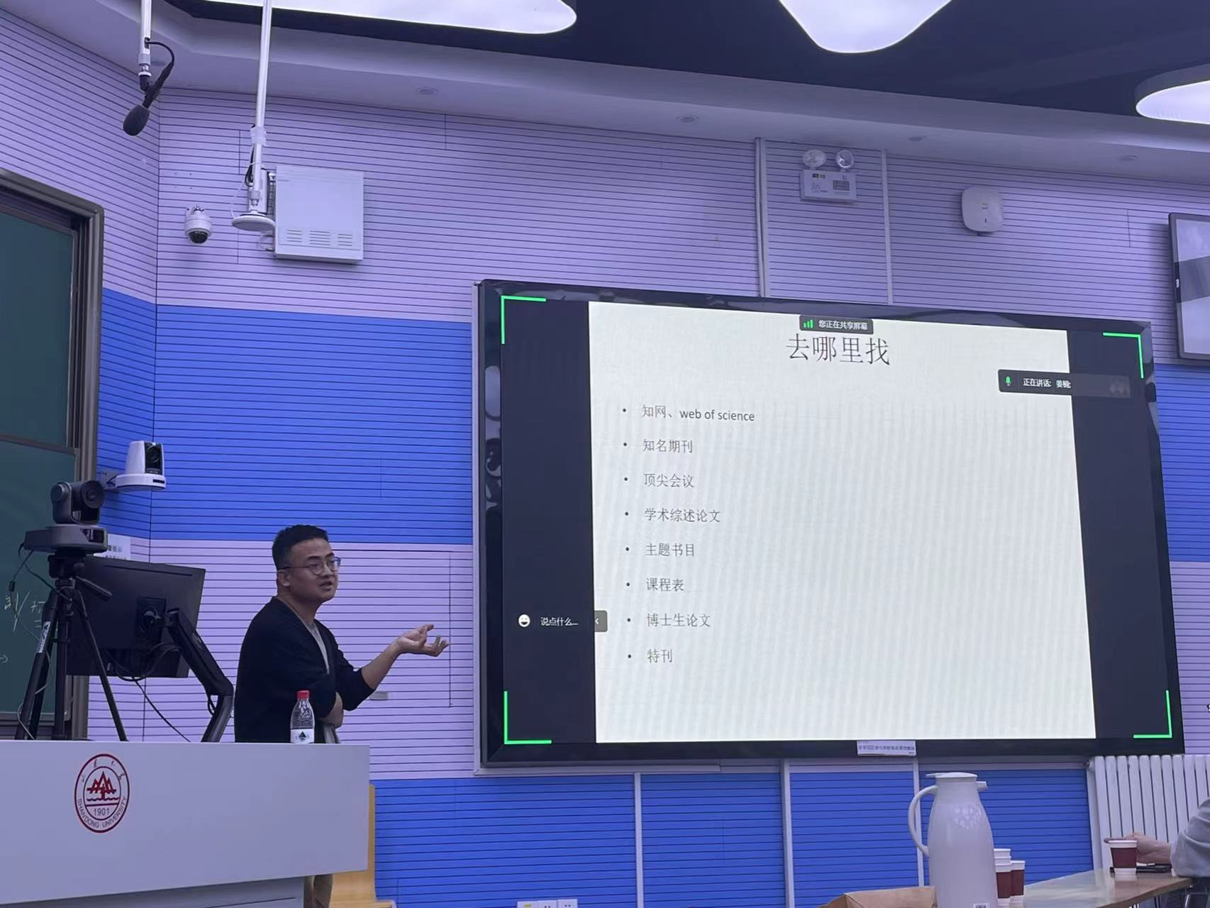 11月17日晚7点,det365官网新生研讨课在董明珠楼112教室如期举行,此次研讨课有幸邀请到了中国人民大学新闻学院副教授苗伟山老师,为2023级本科生带来“选题、文献和方法:本科生论文写作ABC”的精彩分享。本次讲座由班主任姜楠老师主持,与威海校区文化传播学院2023级的同学们线上、线下共同研讨,同时本次课程也吸引了大二、大三的学长学姐,以及研究生学长学姐们旁听学习。