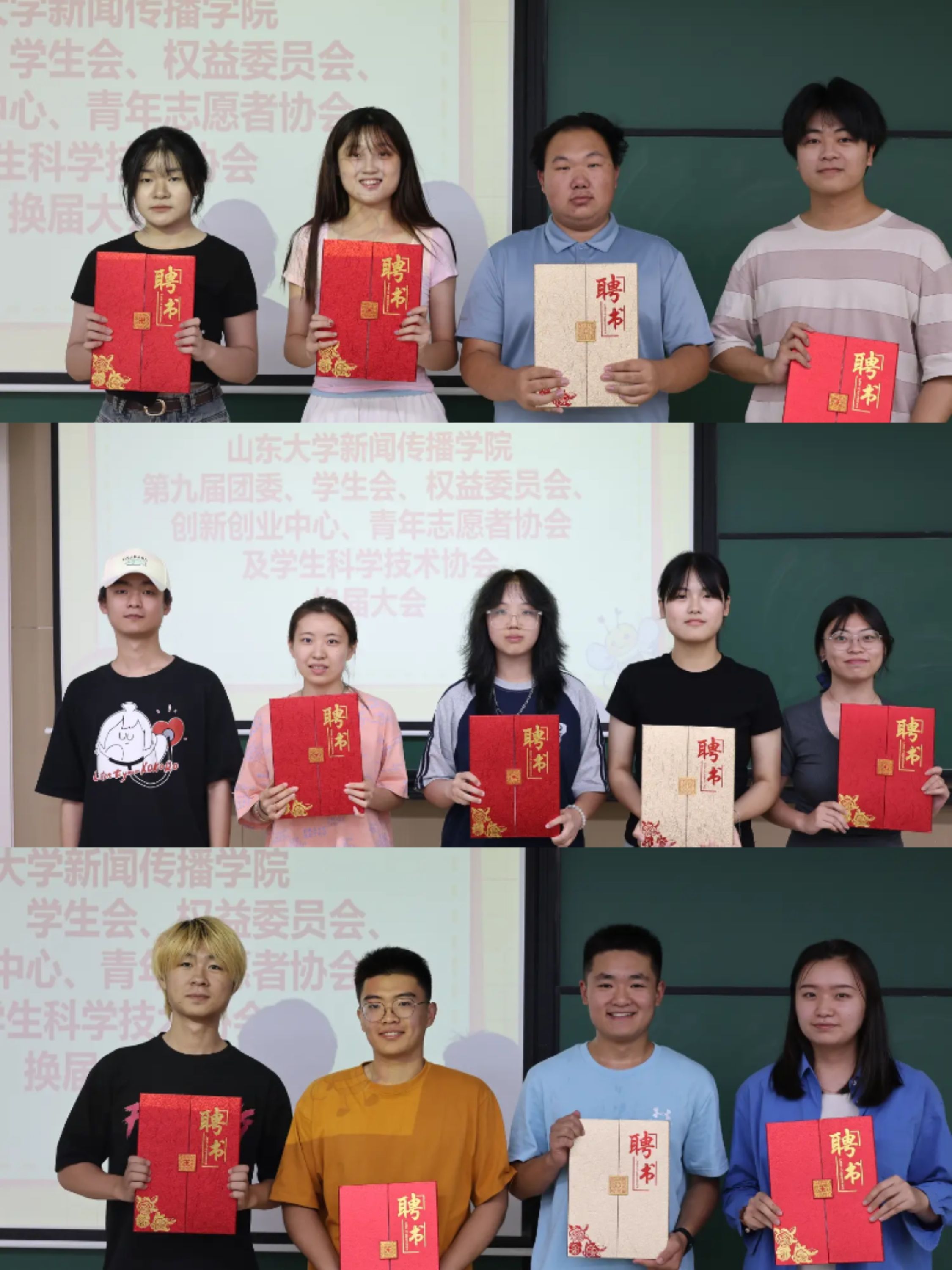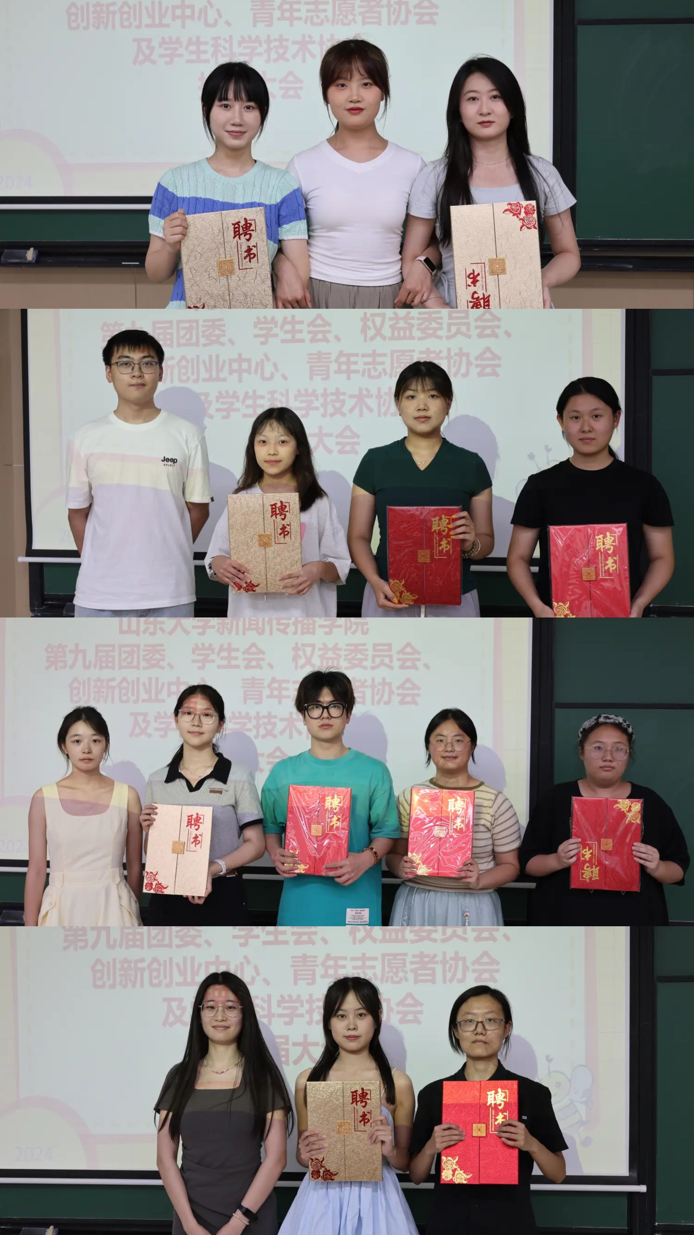 第八届成员们发言结束后,依次向新任团委副书记、主席团成员、部长及副部长们颁发聘书。从此以后,第九届det365登录网站主页团委、学生会、权益委员会、创新创业中心、学生科学技术协会及青年志愿者协会将正式开始下一年的工作。