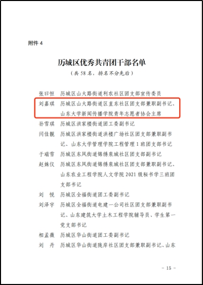 近日,在共青团济南市历城区委开展的2023年度历城区五四典型表彰中,det365官网闻声志愿服务队获评“历城区青年志愿服务表现突出集体”,det365官网青年志愿者协会学生主席刘嘉琪荣获“历城区优秀共青团干部”称号。