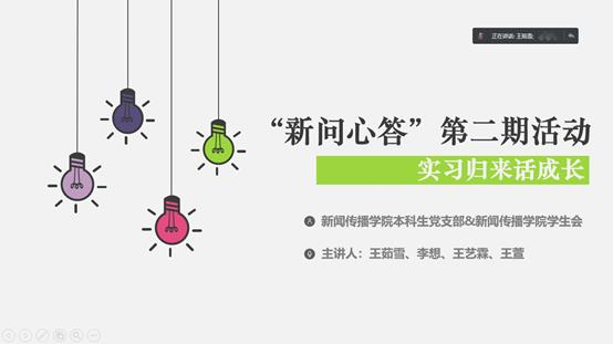 四位同学的分享从多行业、多角度为同学们提供了切实可行的实习建议,帮助同学们了解不同行业的实习工作状态,展现了2017级本科生的优秀实习成果。讲座结束后,“新问心答”工作组继续回答同学们关于实习的问题,联系有相关实习经历的同学进行解答,将2017级的宝贵实习经验整理成“干货分享”文章,通过“新火相传”微信公众号继续分享。