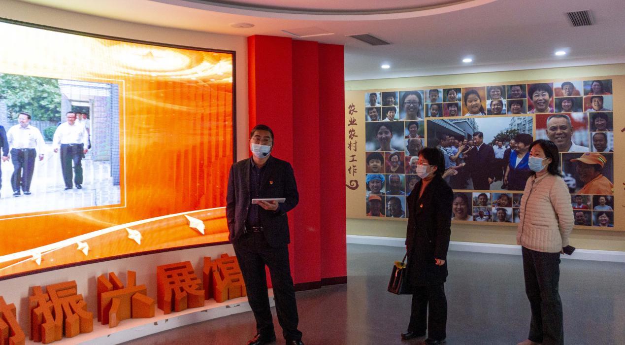 工作互动,资源共享,优势互补是党委共建工作开展的首要动机,三涧溪村党委就率先分享了在乡村振兴工作中的党建经验。村主任叶贵芬带领同学们进入党群服务中心,重走习近平总书记视察路,引领全体师生观看宣传片,聆听工作报告。宣传片中呈现出“支部建在产业链上”的新型党建理念,生动展示了三涧溪村传统农业转型,产业融合发展,公共服务完善,现代化,科技化,数字化生活方式转变后的新样貌,展现出在党的精神熏陶下,三涧溪村基层党委领导组织的活力和实力,以及三涧溪村发展建设的生命力、创造力和创新力。诚如叶贵芬所言,“治穷治乱的关键点,是持续的党建活动。正是党员的引领,以党建为先锋,才能够提升凝聚力,向心力和践行力,为实现乡村振兴夯实物质基础。”
