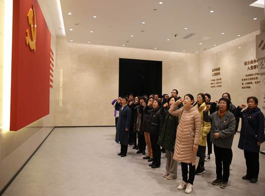 在宣誓厅,全体党员干部面对鲜红的党旗,庄严宣誓,重温入党誓词,感悟入党初心、进一步坚定了为共产主义事业奋斗终生的坚定信念。