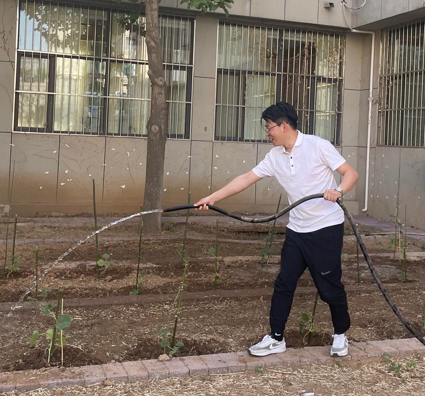 今年春季,共种植葫芦20余株、薰衣草400余株,学院师生通过合理分工、共同合作:男教工和男生们承包了大量体力活,用水管浇水,湿润土地,然后用锄头开垦荒地,女教工和女生们有的撕开包裹花苗底部的塑料纸、传递进小菜园,有的用小铲子挖开开垦好的地,将花苗种植进去,一起完成耕种工作。大家满怀期待,希望幼苗在小菜园里茁壮成长,历经日夜,早日绽放花朵、收获果实。