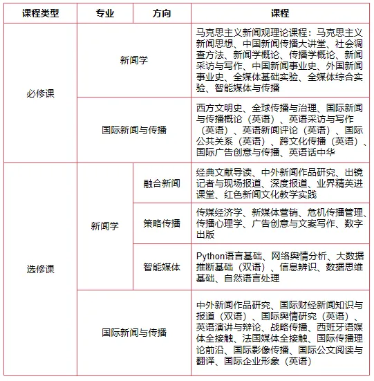 新闻学专业2019年度入选首批国家级一流本科专业建设点。大二时进行方向分流,包括融合新闻方向、策略传播方向、智能媒体方向。